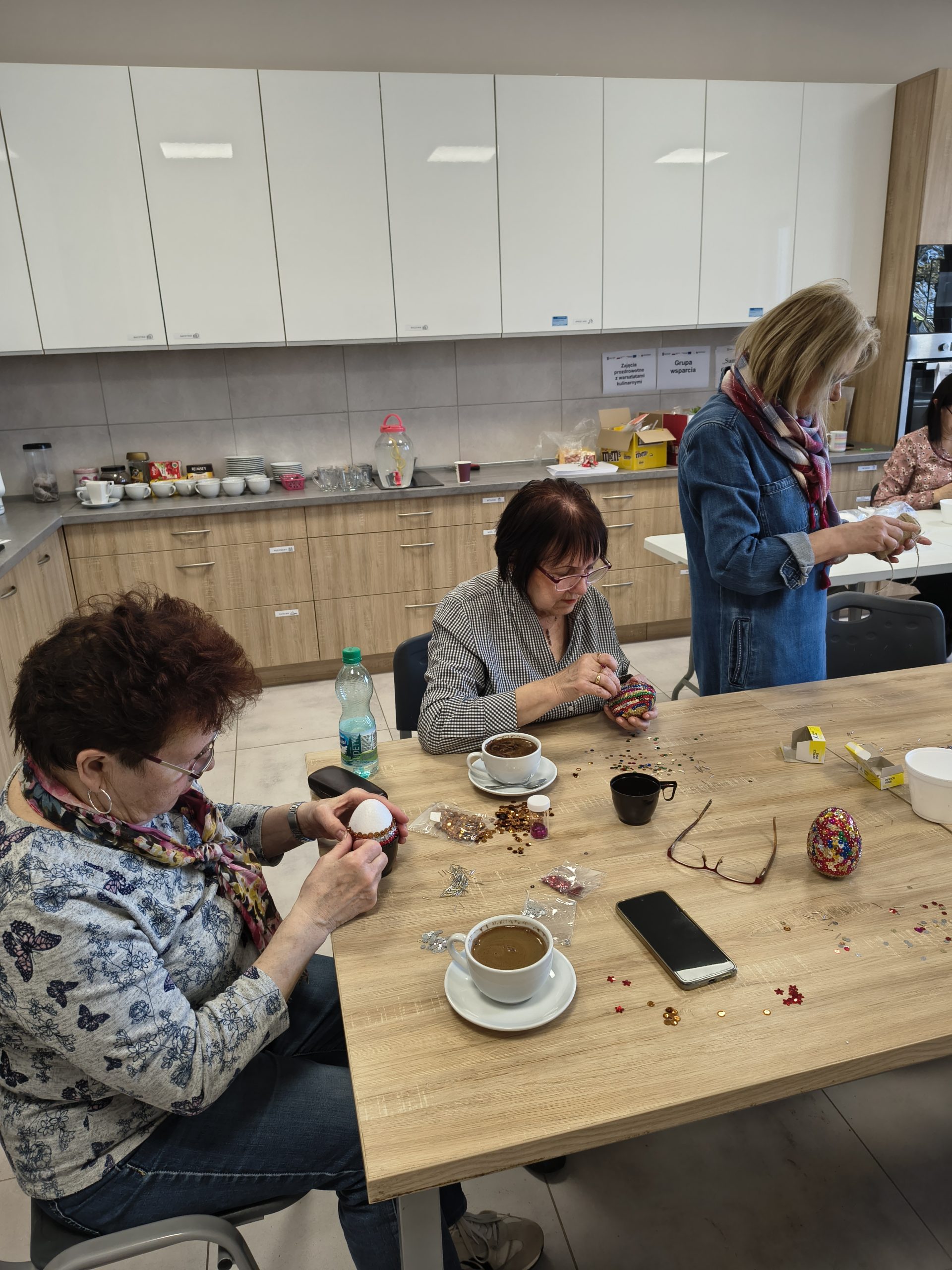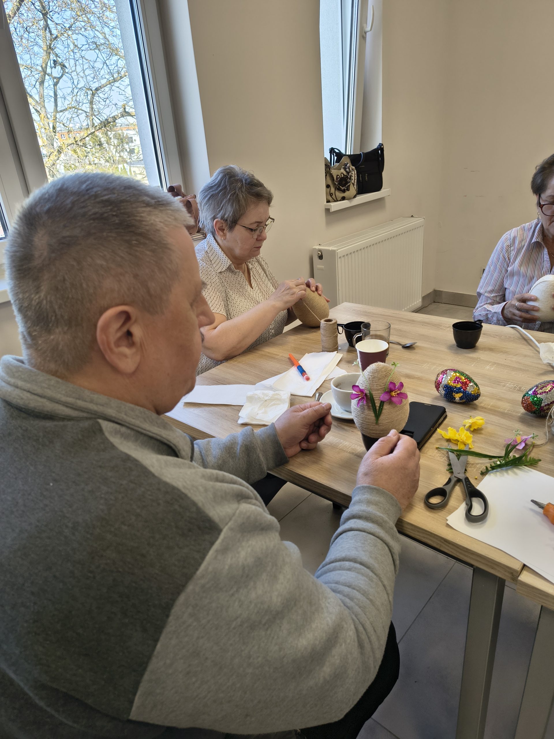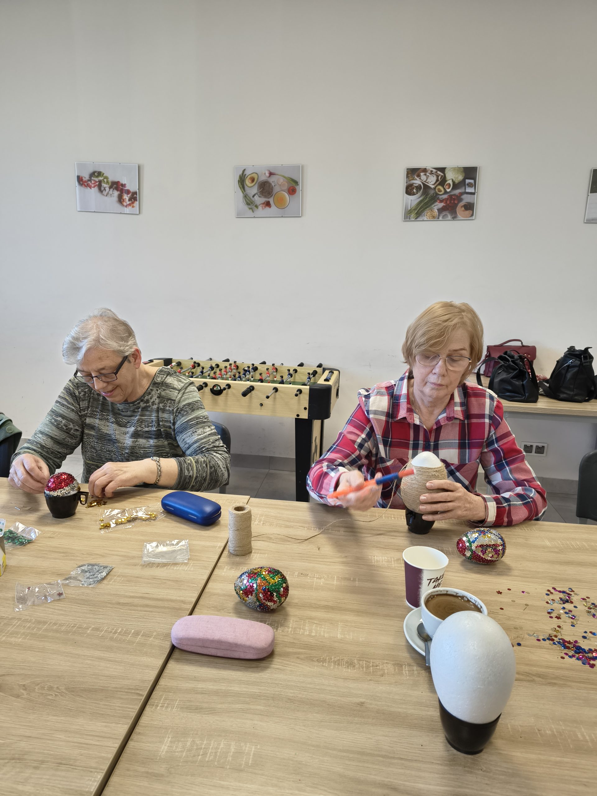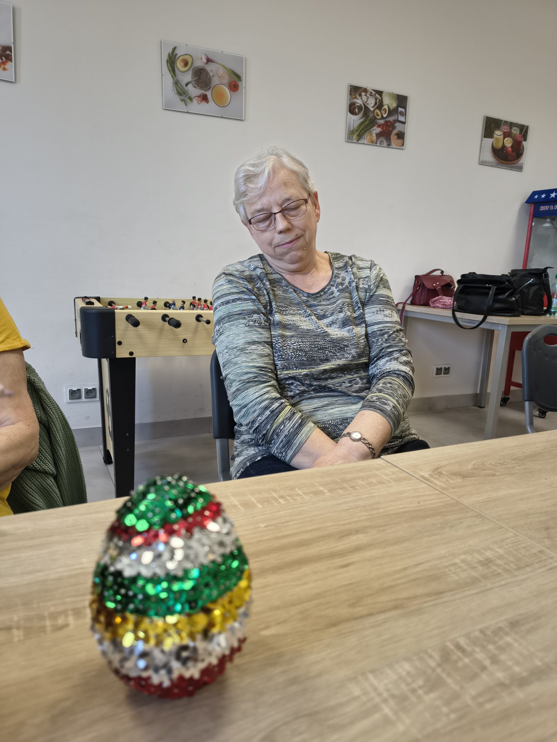 Podczas zajęć uczestnicy wykonywali ozdoby wielkanocne – jajka styropianowe wykładane i dekorowane cekinami. Każda osoba miała możliwość samodzielnego doboru kolorów, wzorów oraz sposobu zdobienia, co sprzyjało rozwijaniu kreatywności i wyobraźni artystycznej.