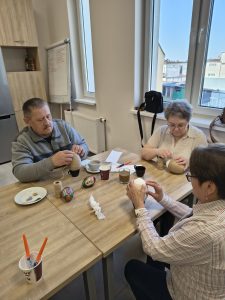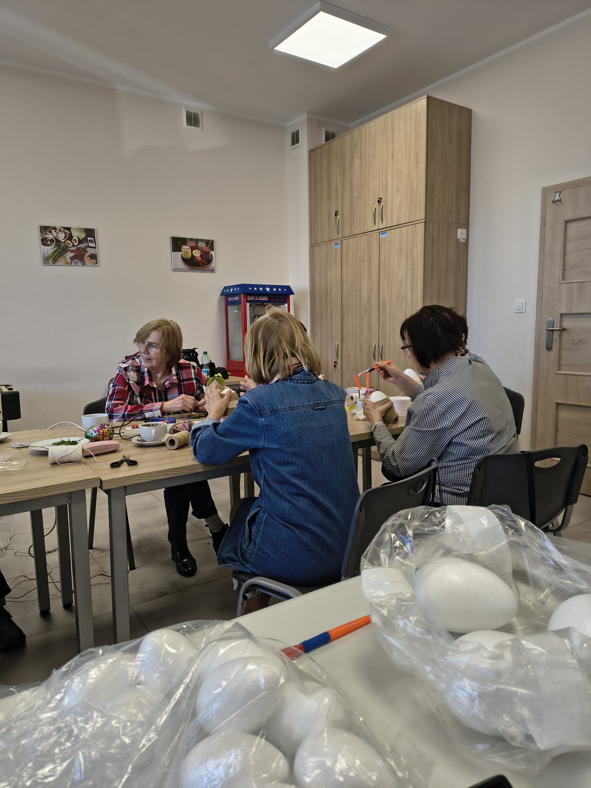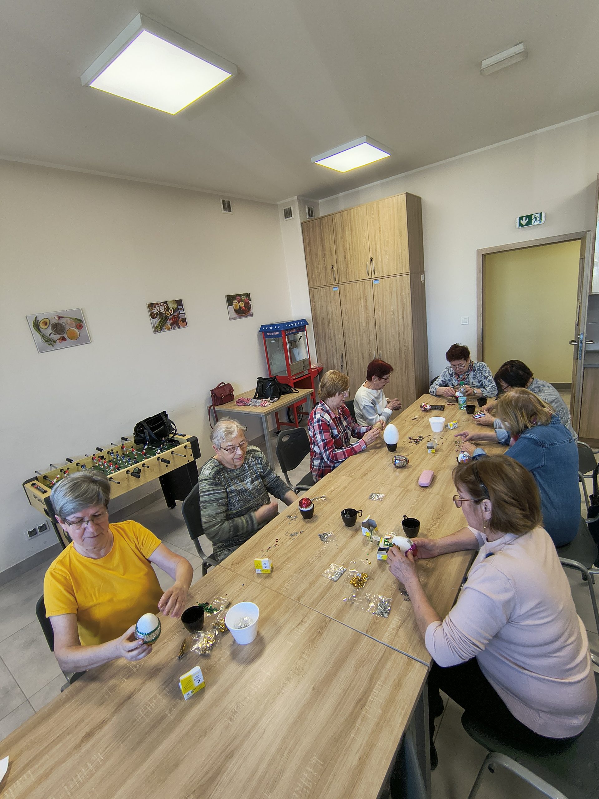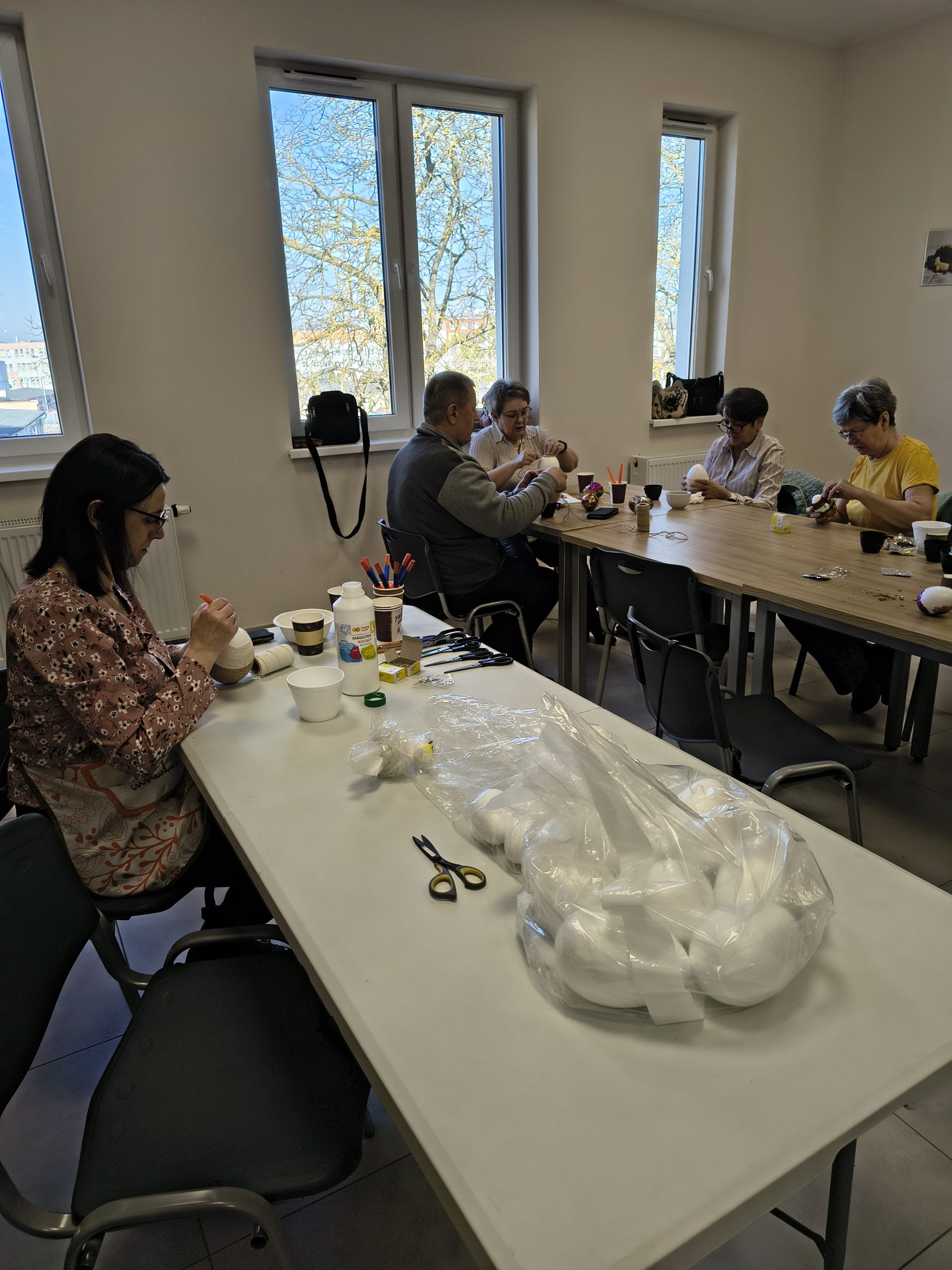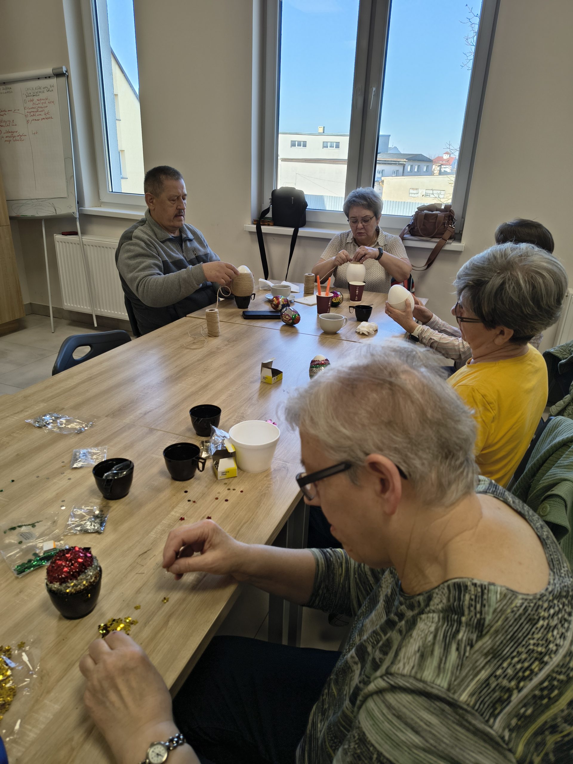Podczas zajęć uczestnicy wykonywali ozdoby wielkanocne – jajka styropianowe wykładane i dekorowane cekinami. Każda osoba miała możliwość samodzielnego doboru kolorów, wzorów oraz sposobu zdobienia, co sprzyjało rozwijaniu kreatywności i wyobraźni artystycznej.
