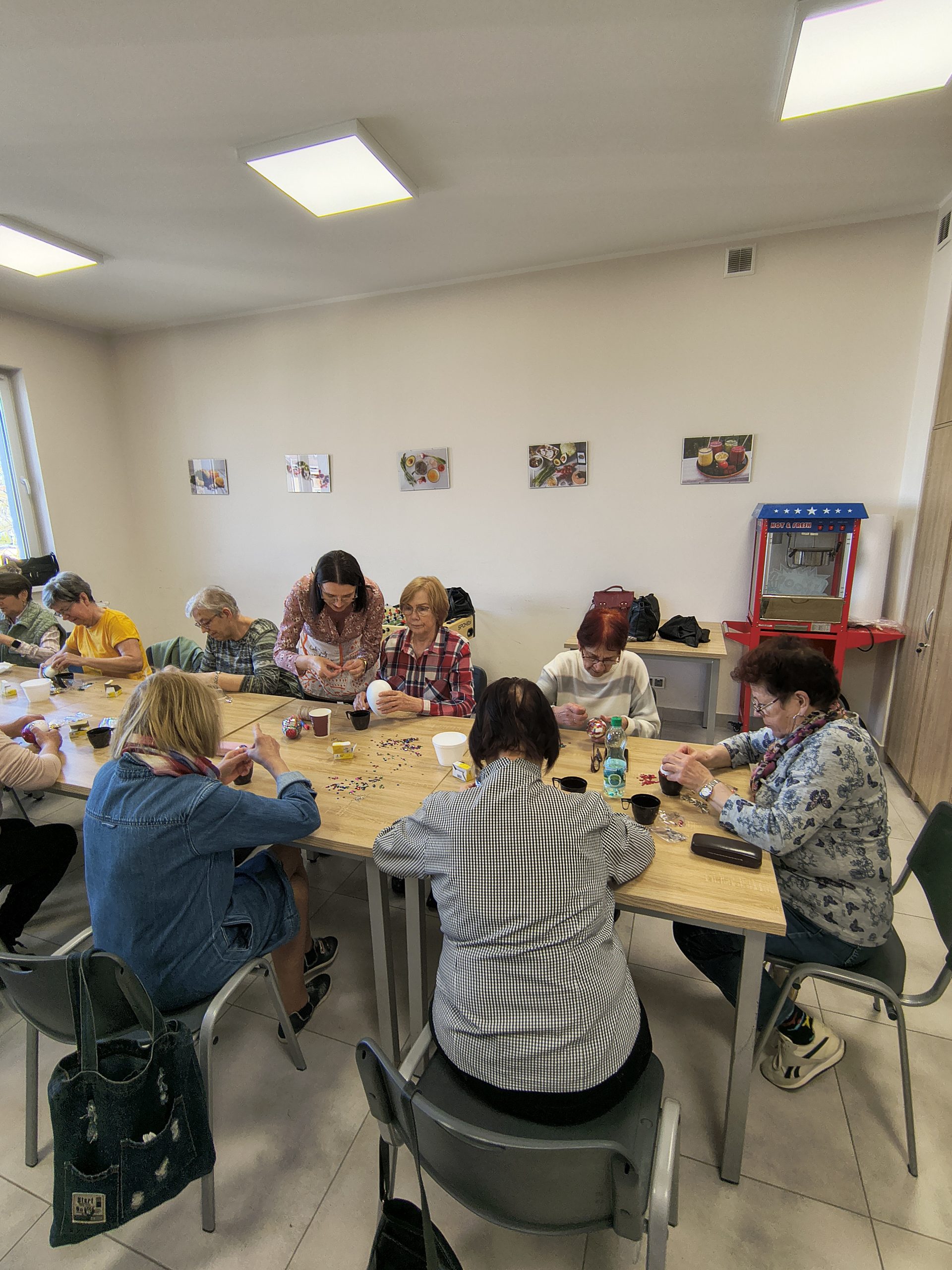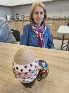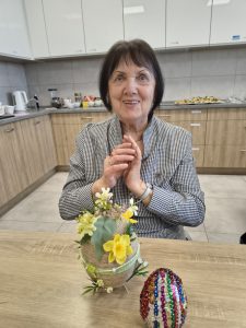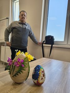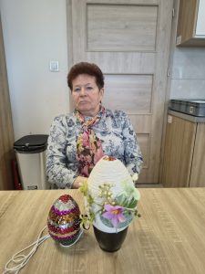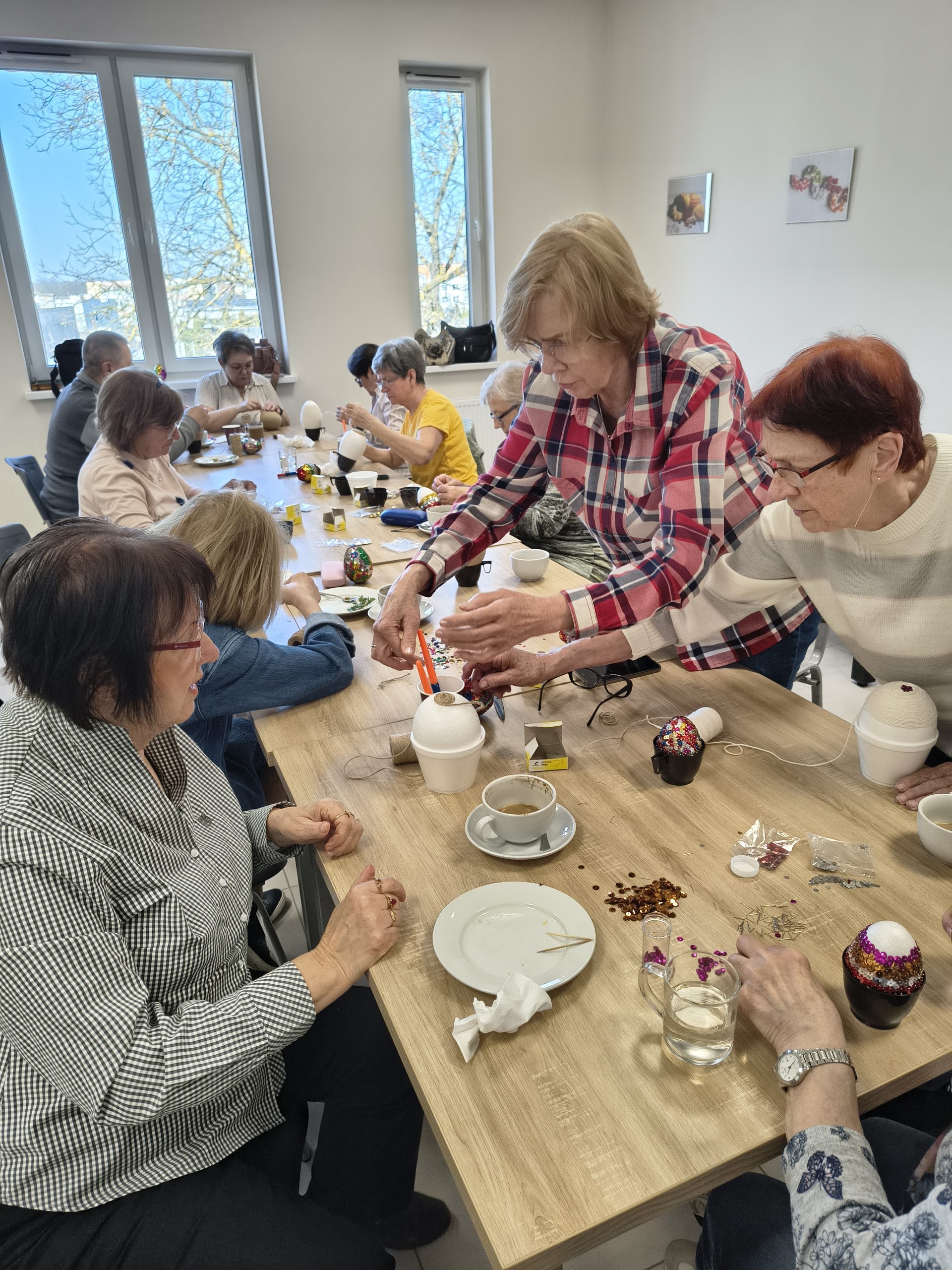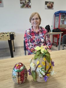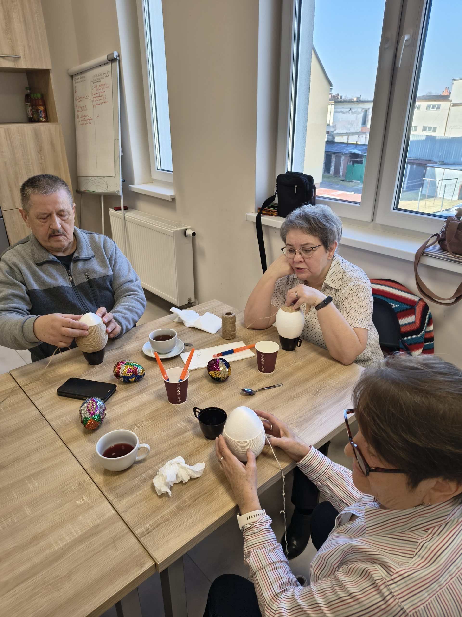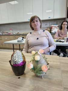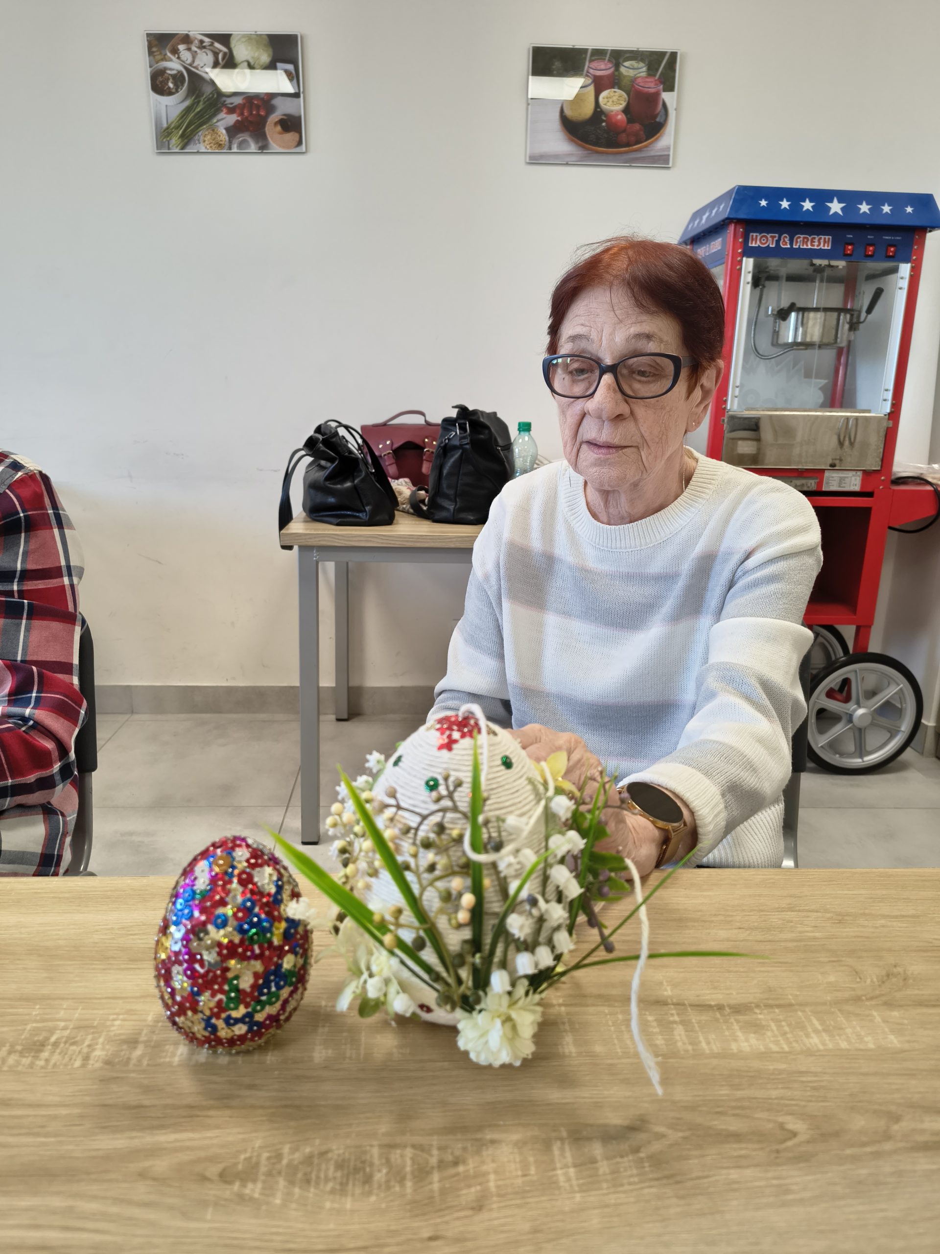Podczas zajęć uczestnicy wykonywali ozdoby wielkanocne – jajka styropianowe wykładane i dekorowane cekinami. Każda osoba miała możliwość samodzielnego doboru kolorów, wzorów oraz sposobu zdobienia, co sprzyjało rozwijaniu kreatywności i wyobraźni artystycznej.