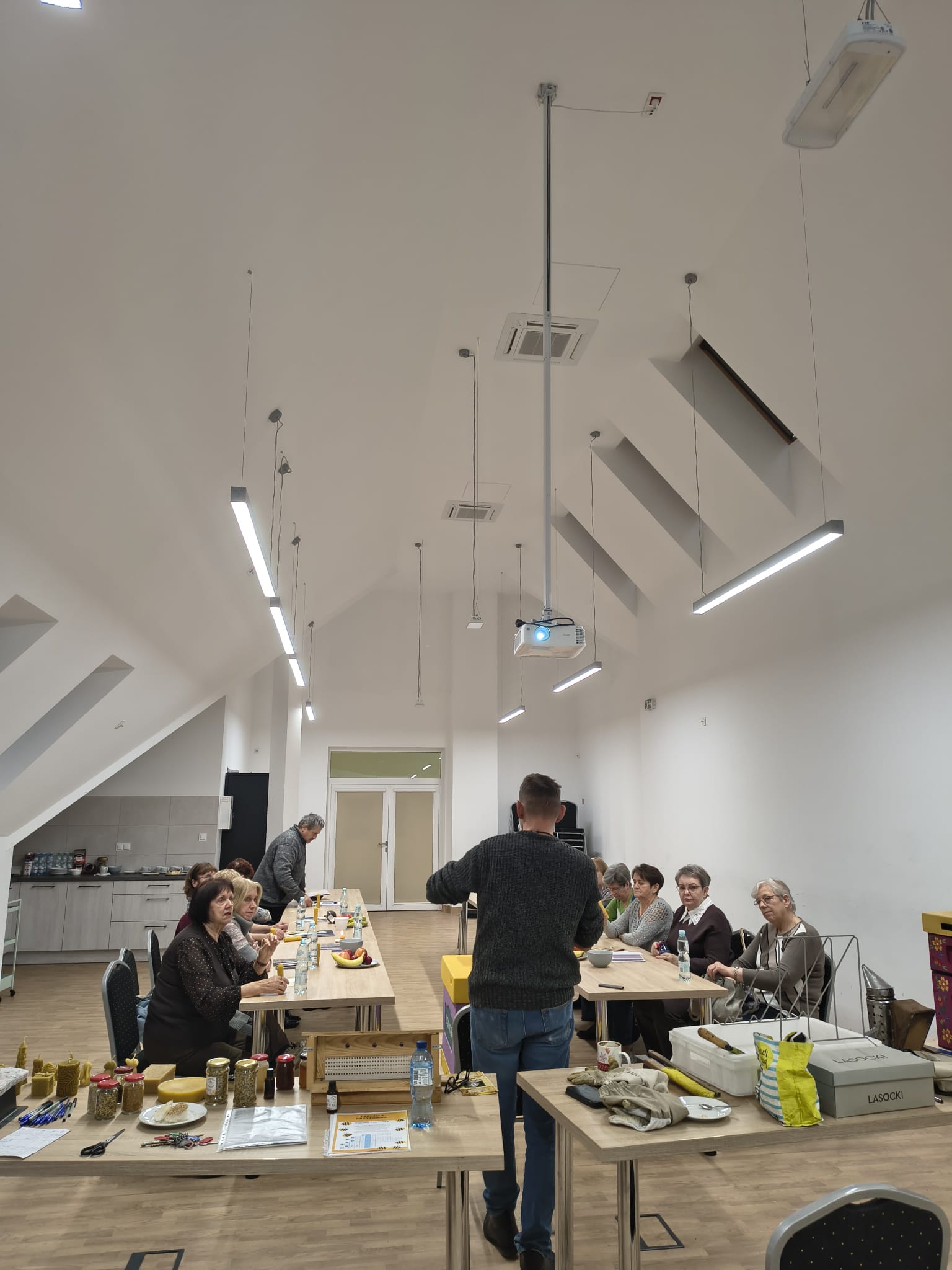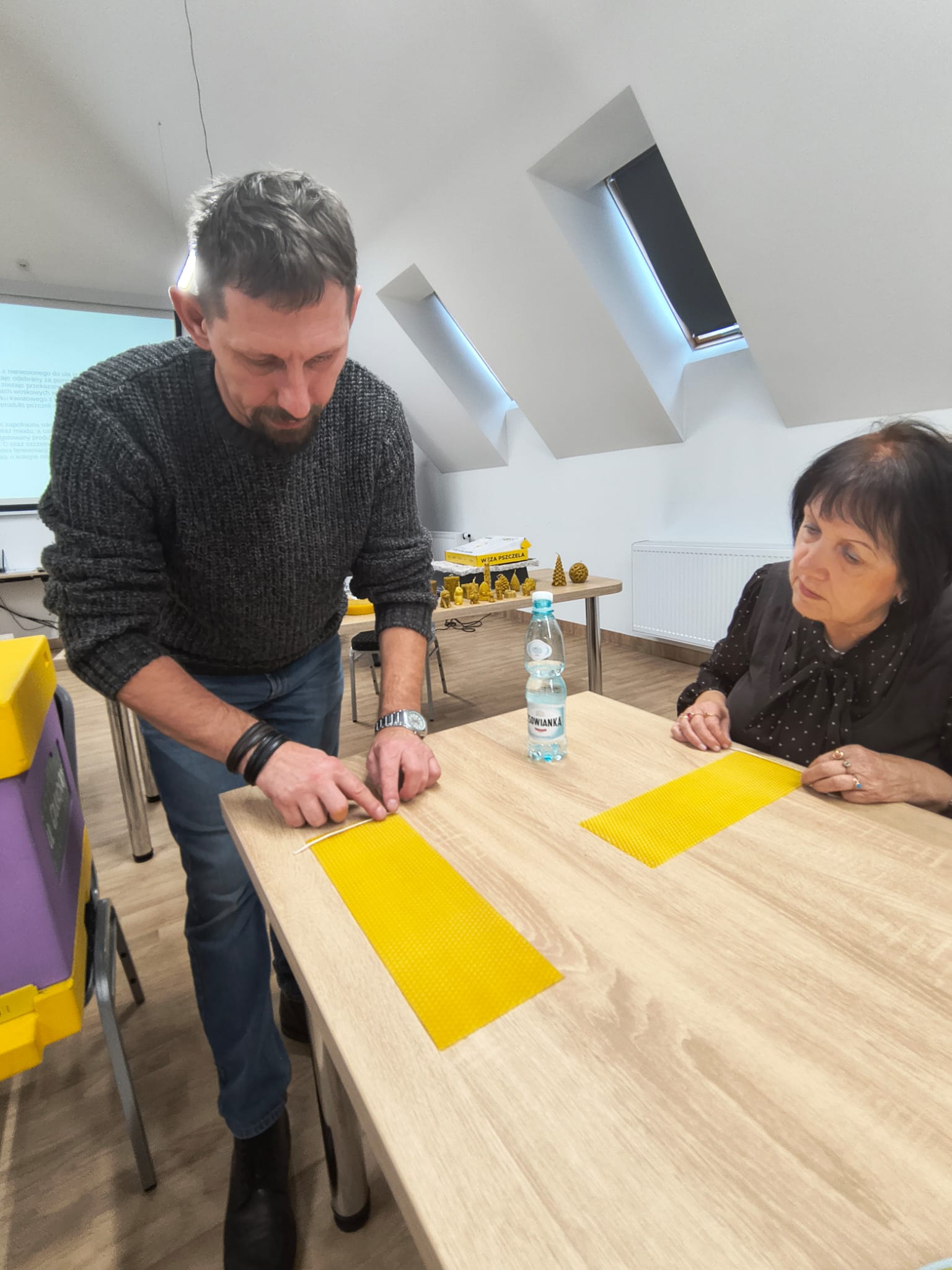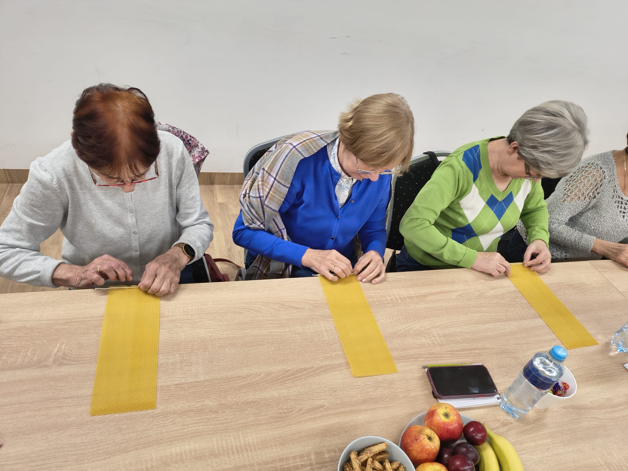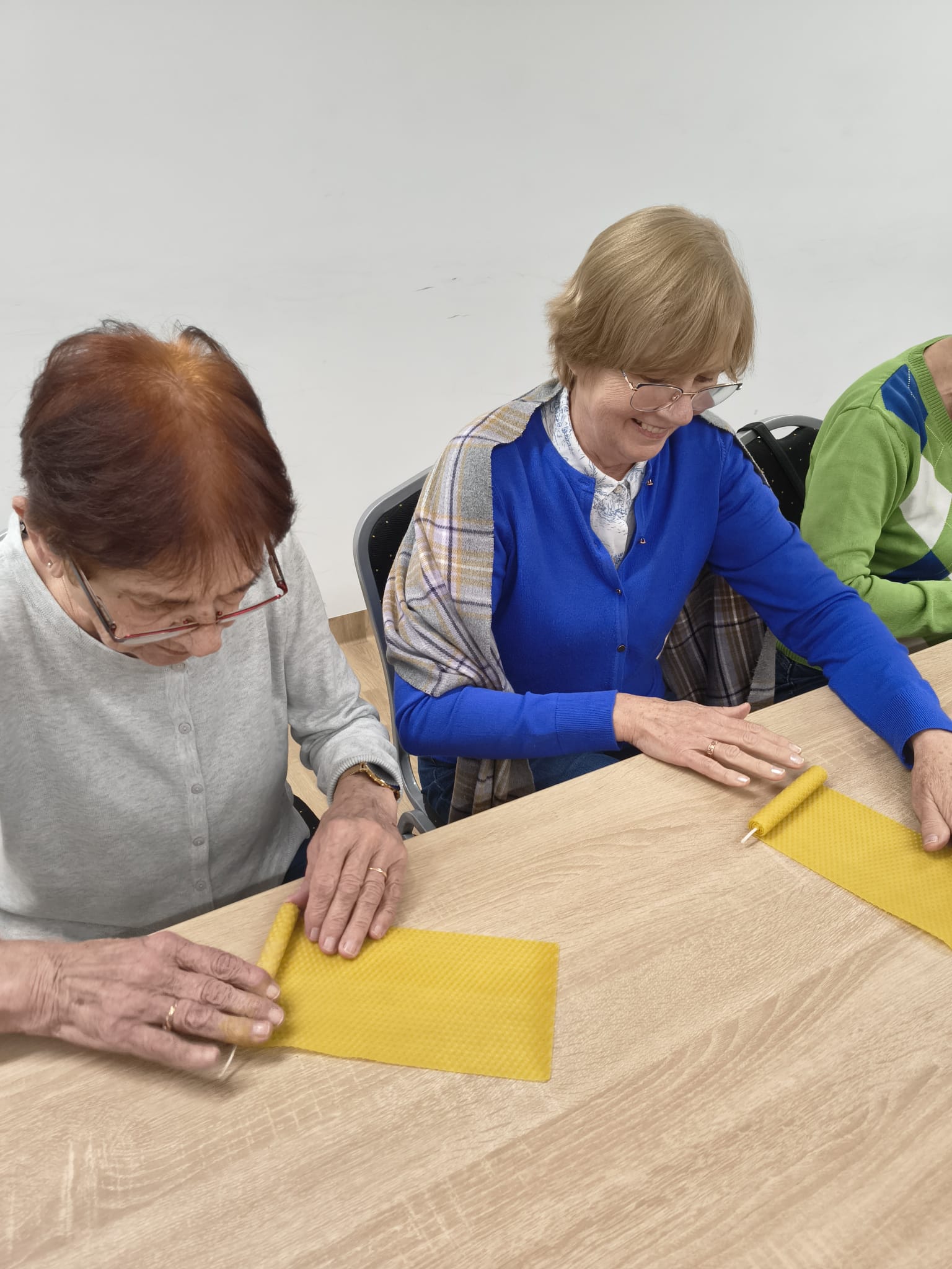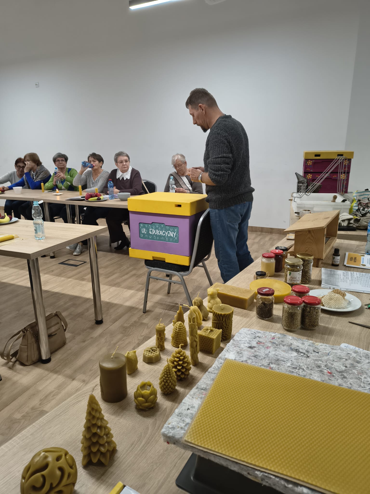 Zajęcia rozpoczęły się wykładem z pszczelarstwa, podczas którego seniorzy poznali znaczenie miodu, pyłku pszczelego i innych produktów pszczelich w codziennej diecie oraz ich wpływ na zdrowie. Bezpośrednio po wykładzie odbyły się warsztaty tworzenia świec, podczas których każdy uczestnik mógł własnoręcznie wykonać naturalną świecę, poznając przy tym praktyczne techniki pracy z woskiem.