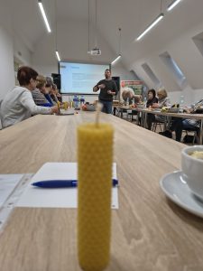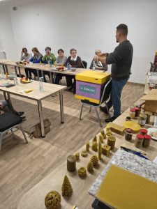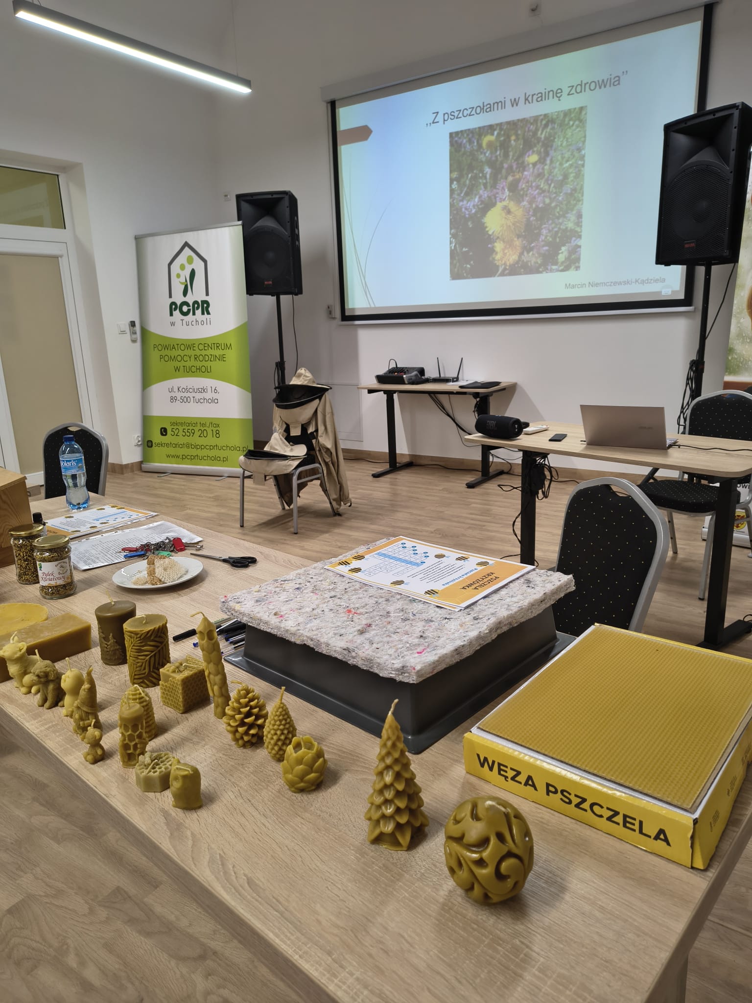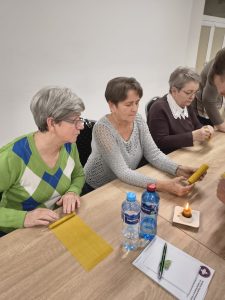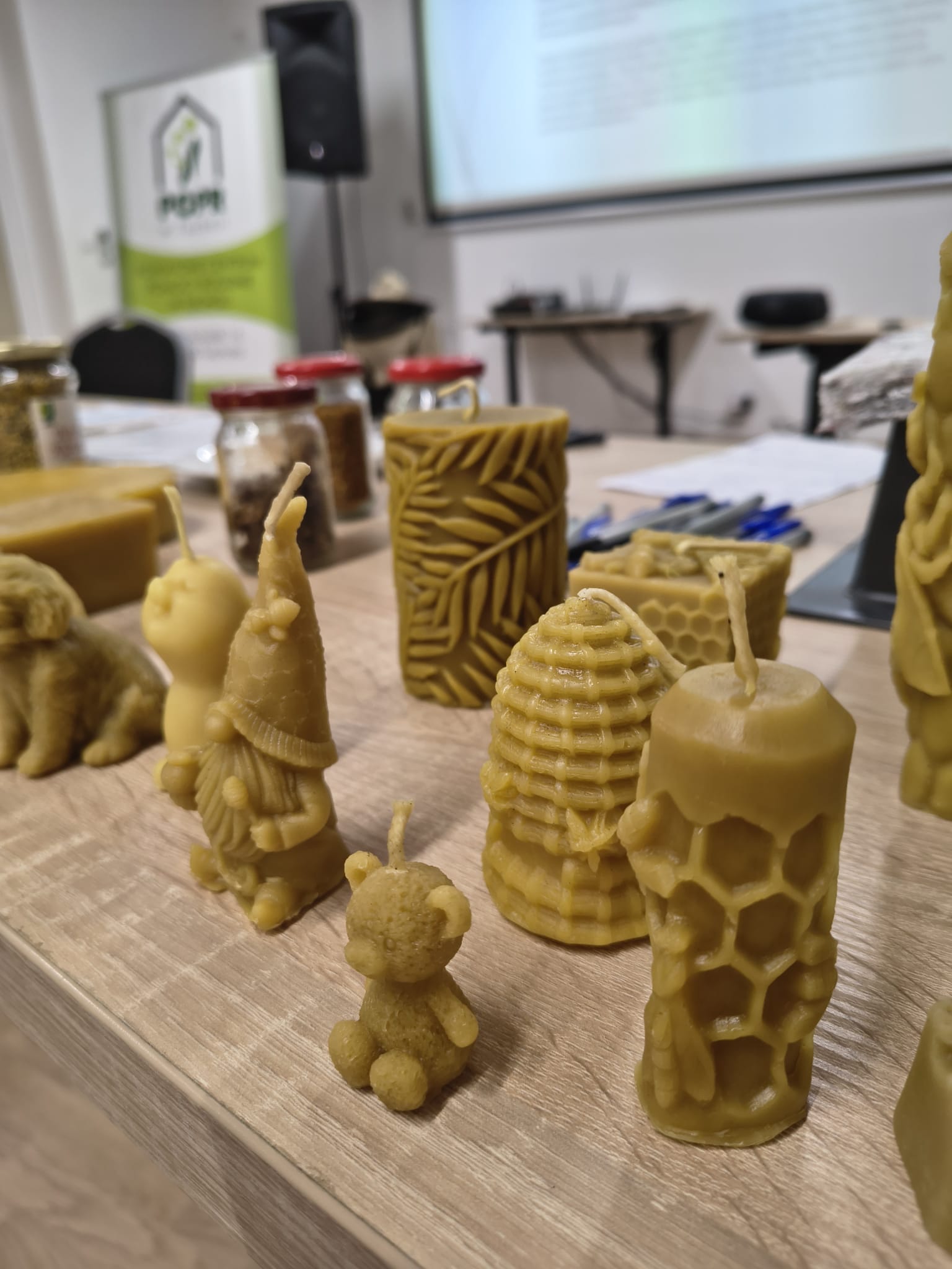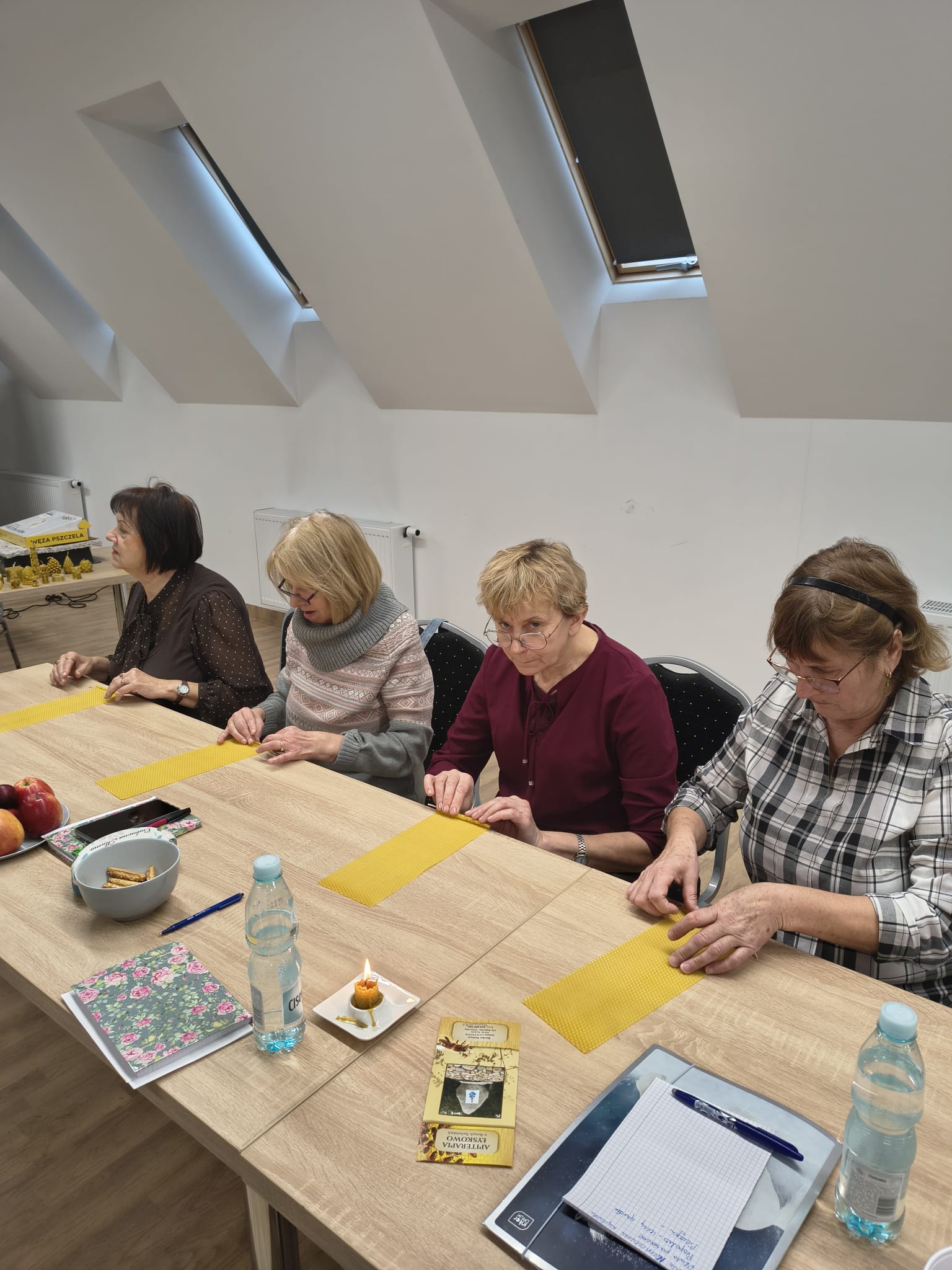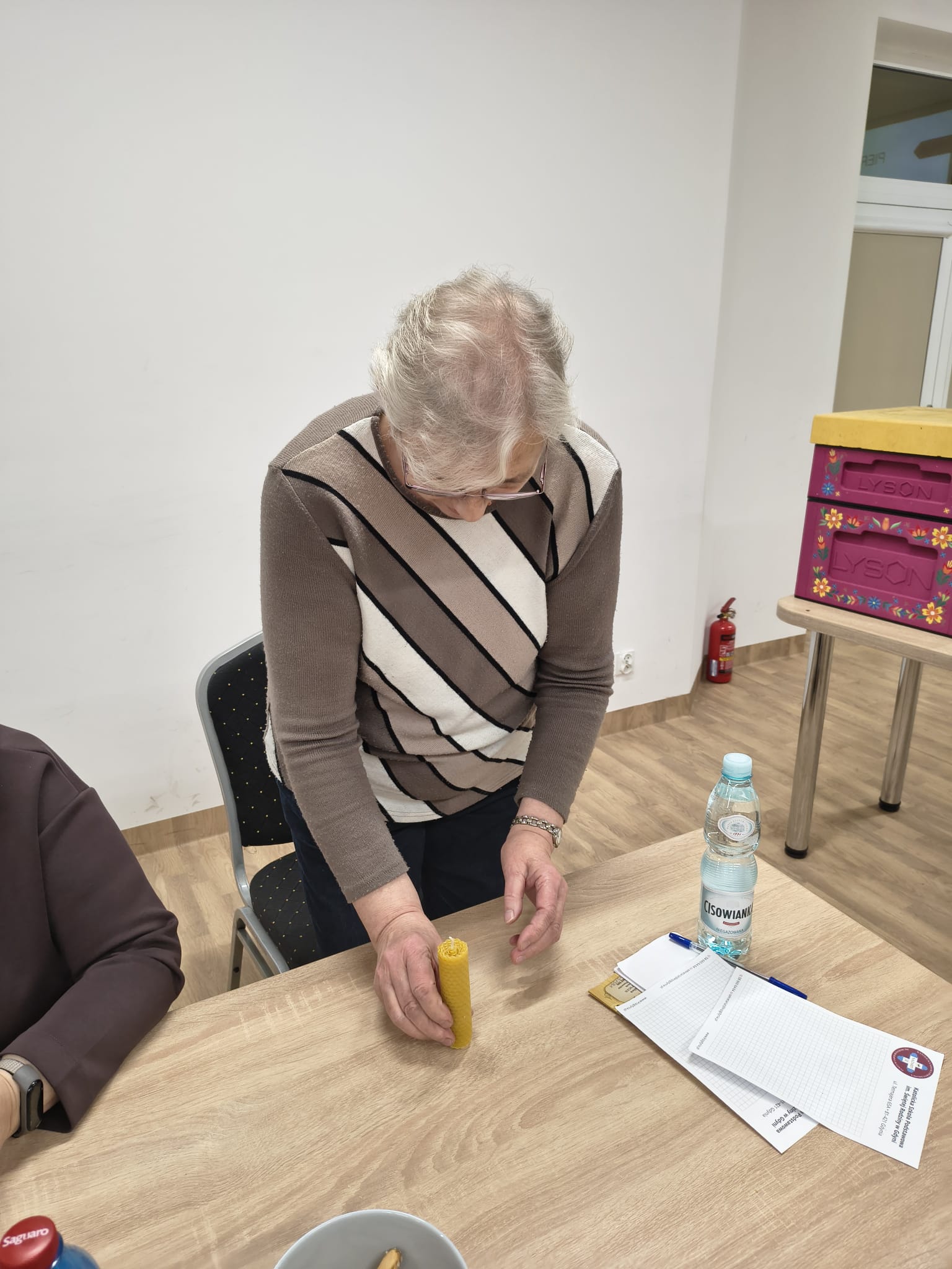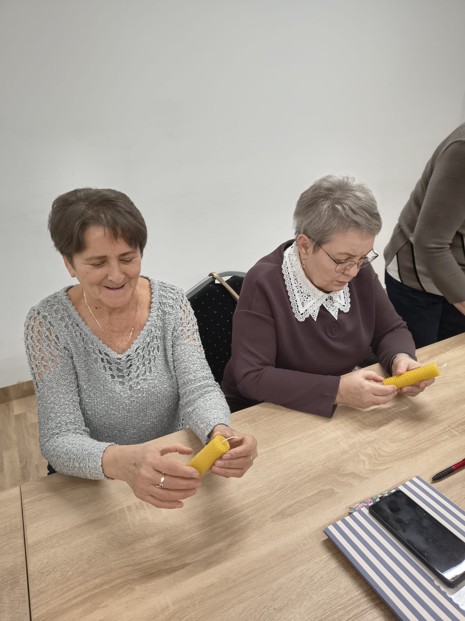 Zajęcia rozpoczęły się wykładem z pszczelarstwa, podczas którego seniorzy poznali znaczenie miodu, pyłku pszczelego i innych produktów pszczelich w codziennej diecie oraz ich wpływ na zdrowie. Bezpośrednio po wykładzie odbyły się warsztaty tworzenia świec, podczas których każdy uczestnik mógł własnoręcznie wykonać naturalną świecę, poznając przy tym praktyczne techniki pracy z woskiem.
