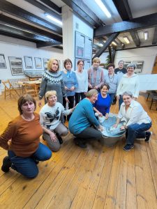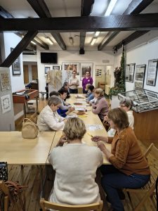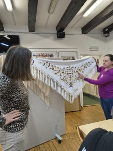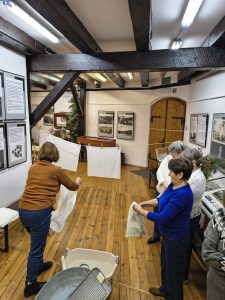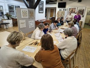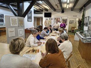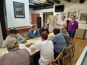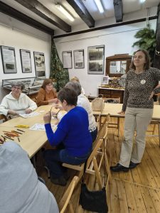 Po zakończeniu warsztatów jedna z pracownic muzeum przedstawiła dodatkową prelekcję dotyczącą historii haftu borowiackiego, omawiając jego charakterystyczne kolory, motywy roślinne oraz znaczenie poszczególnych wzorów w tradycji regionalnej. Spotkanie pozwoliło uczestnikom poszerzyć wiedzę o kulturze regionu, rozwinąć umiejętności manualne oraz spędzić czas w atmosferze integracji i wspólnego poznawania dziedzictwa lokalnego.