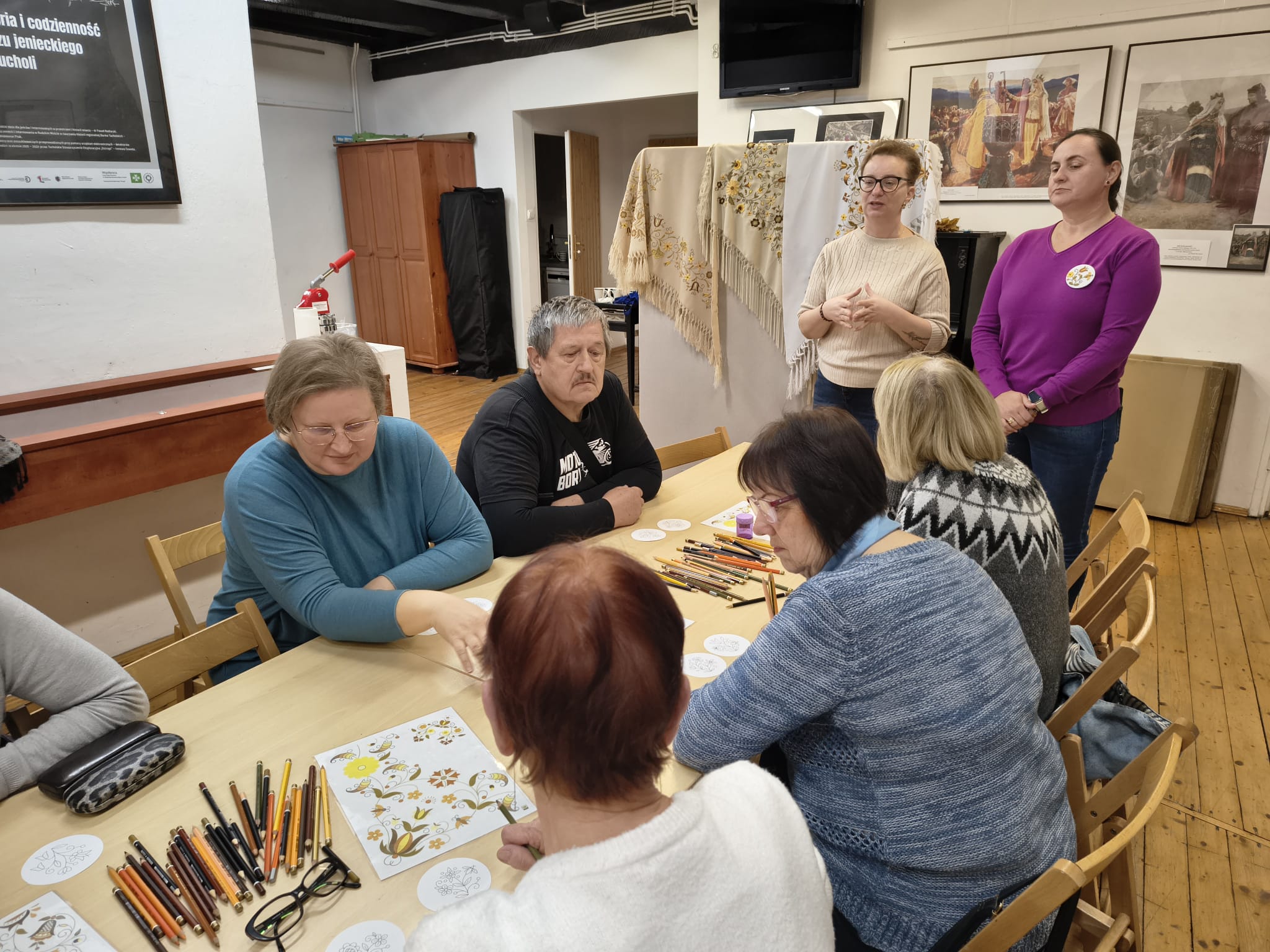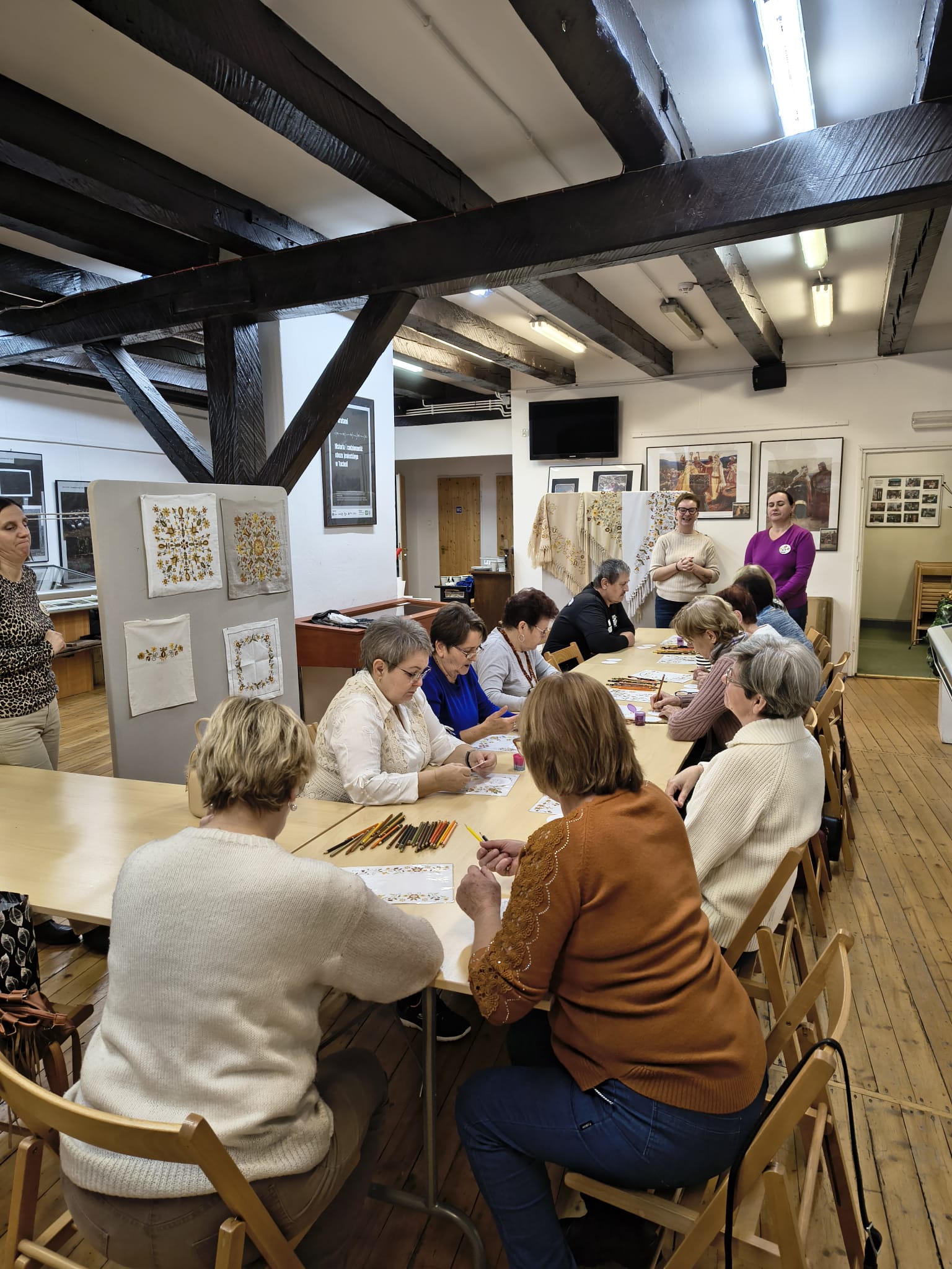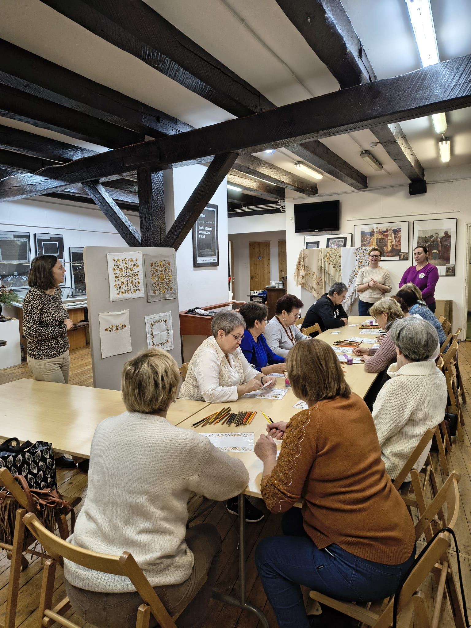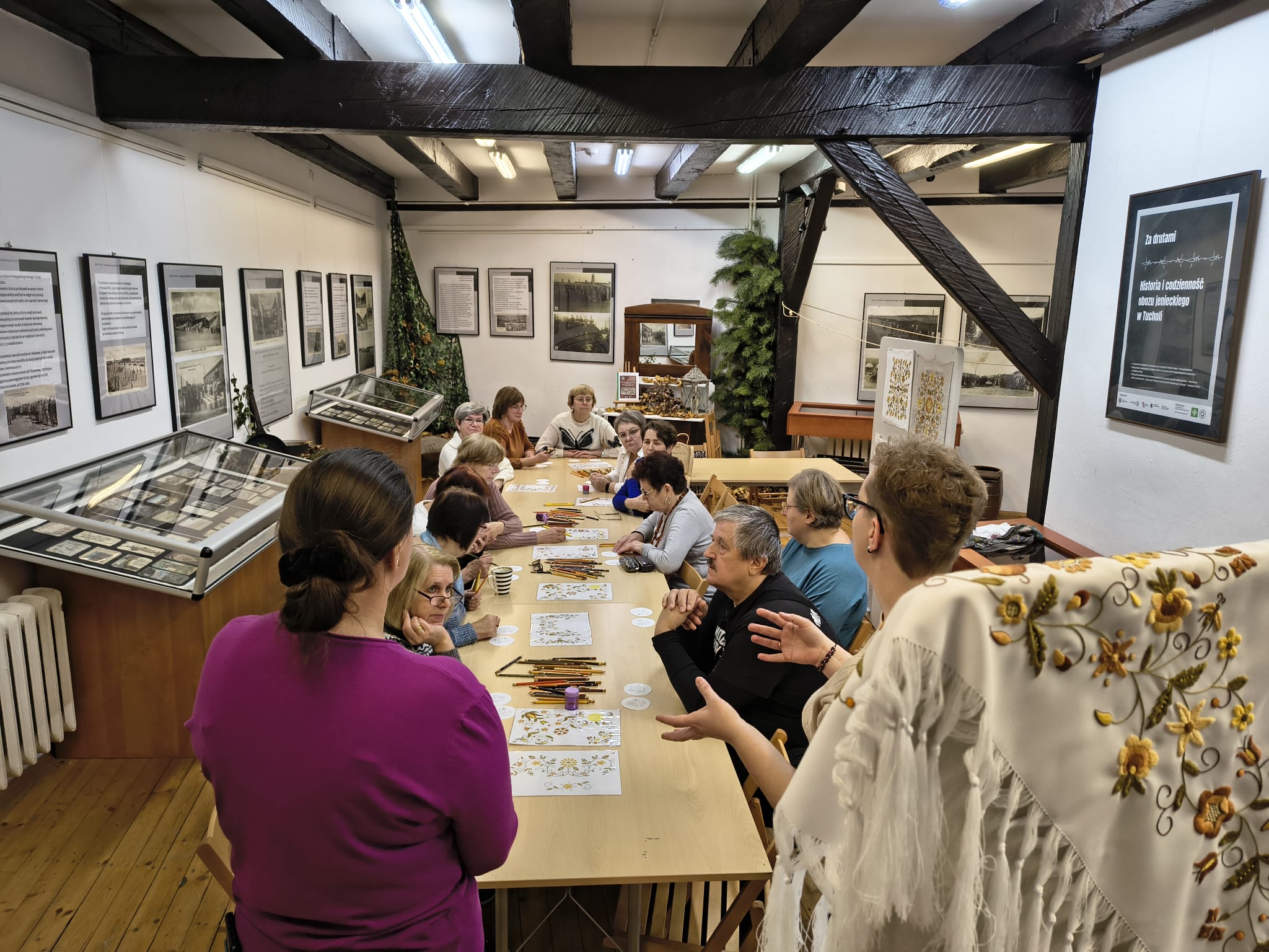 Po zakończeniu warsztatów jedna z pracownic muzeum przedstawiła dodatkową prelekcję dotyczącą historii haftu borowiackiego, omawiając jego charakterystyczne kolory, motywy roślinne oraz znaczenie poszczególnych wzorów w tradycji regionalnej. Spotkanie pozwoliło uczestnikom poszerzyć wiedzę o kulturze regionu, rozwinąć umiejętności manualne oraz spędzić czas w atmosferze integracji i wspólnego poznawania dziedzictwa lokalnego.