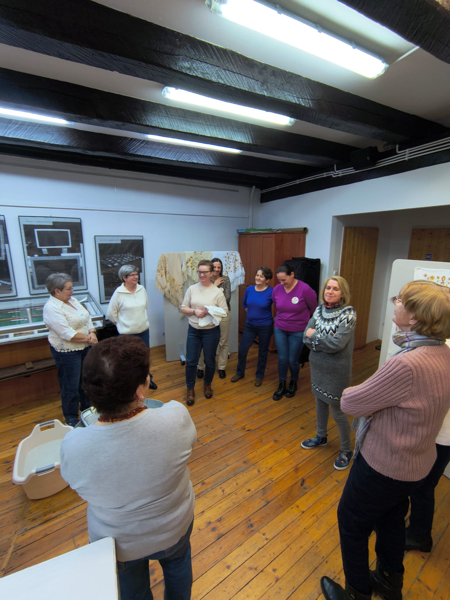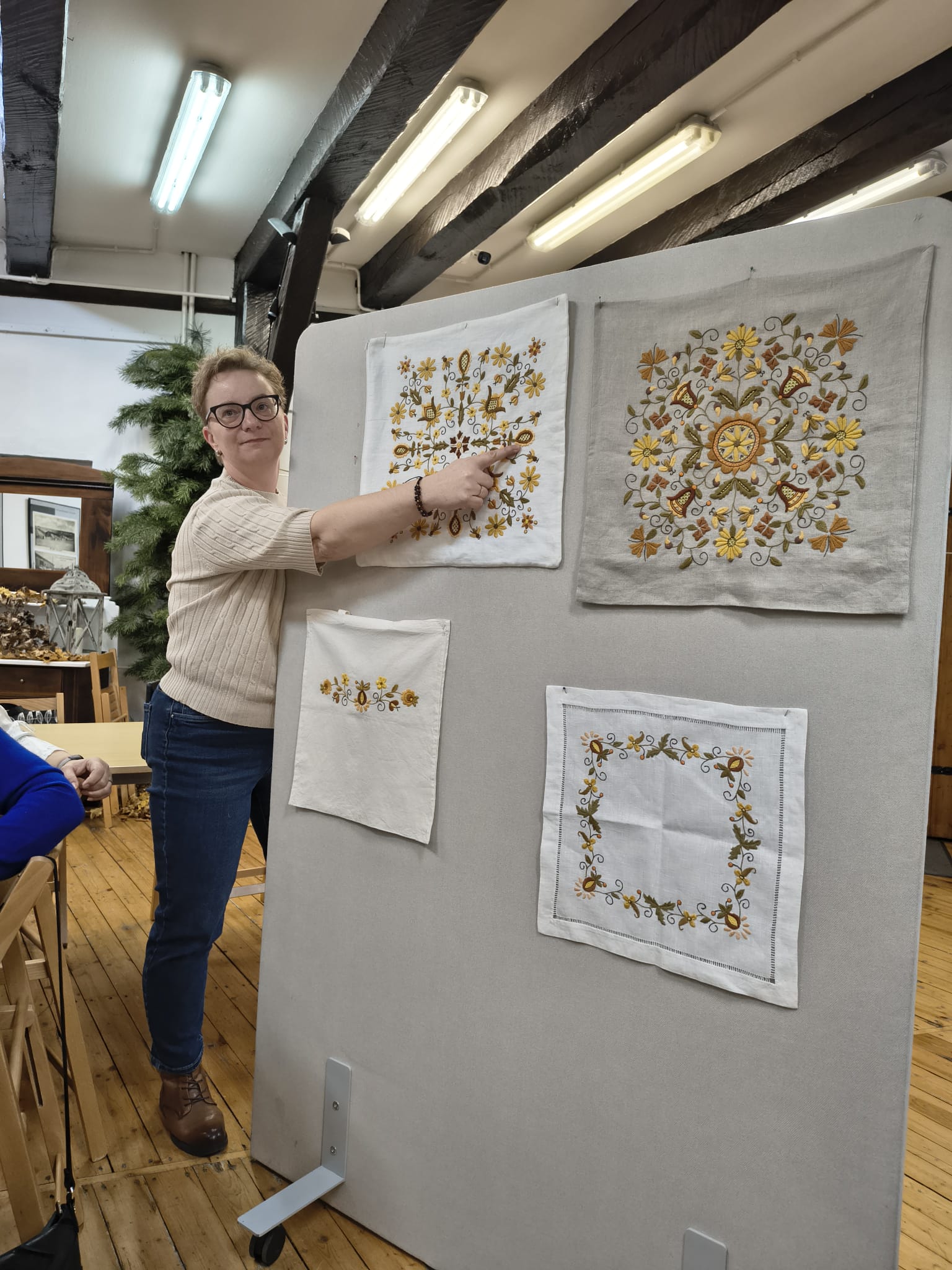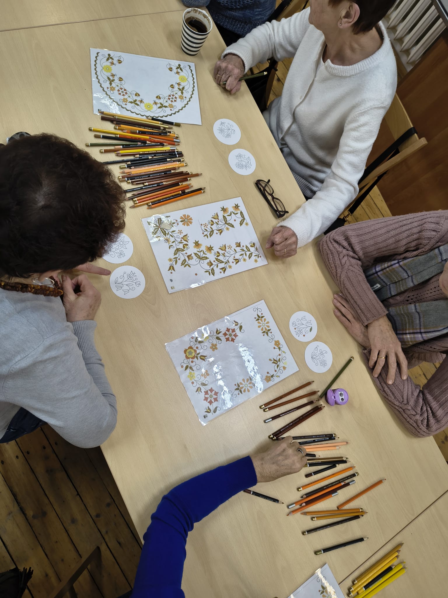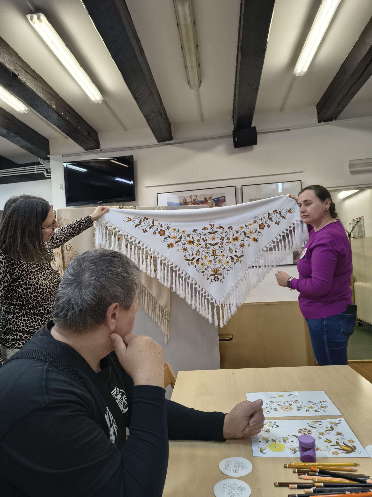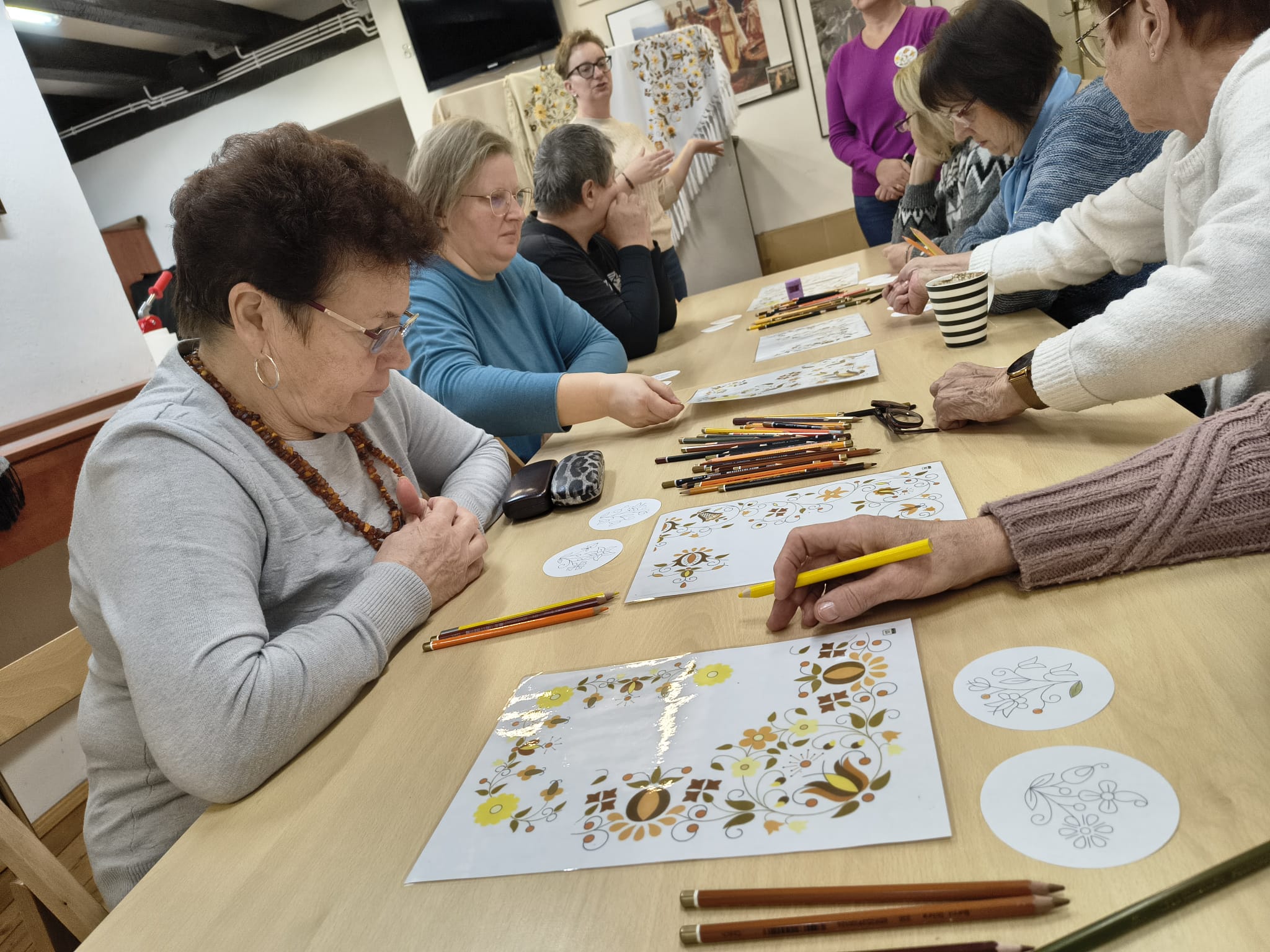 Po zakończeniu warsztatów jedna z pracownic muzeum przedstawiła dodatkową prelekcję dotyczącą historii haftu borowiackiego, omawiając jego charakterystyczne kolory, motywy roślinne oraz znaczenie poszczególnych wzorów w tradycji regionalnej. Spotkanie pozwoliło uczestnikom poszerzyć wiedzę o kulturze regionu, rozwinąć umiejętności manualne oraz spędzić czas w atmosferze integracji i wspólnego poznawania dziedzictwa lokalnego.